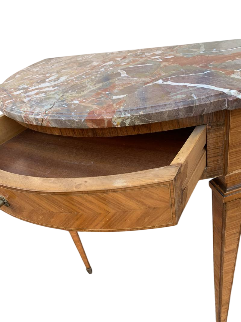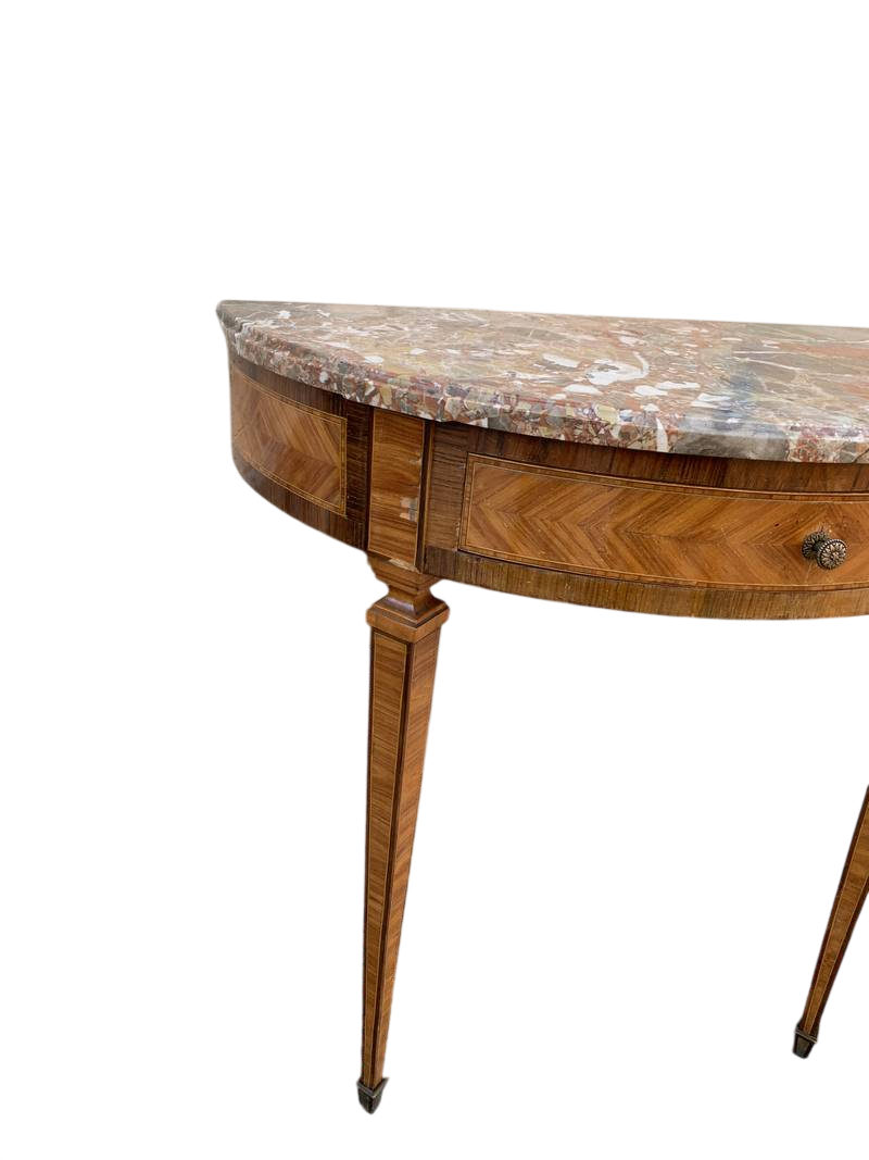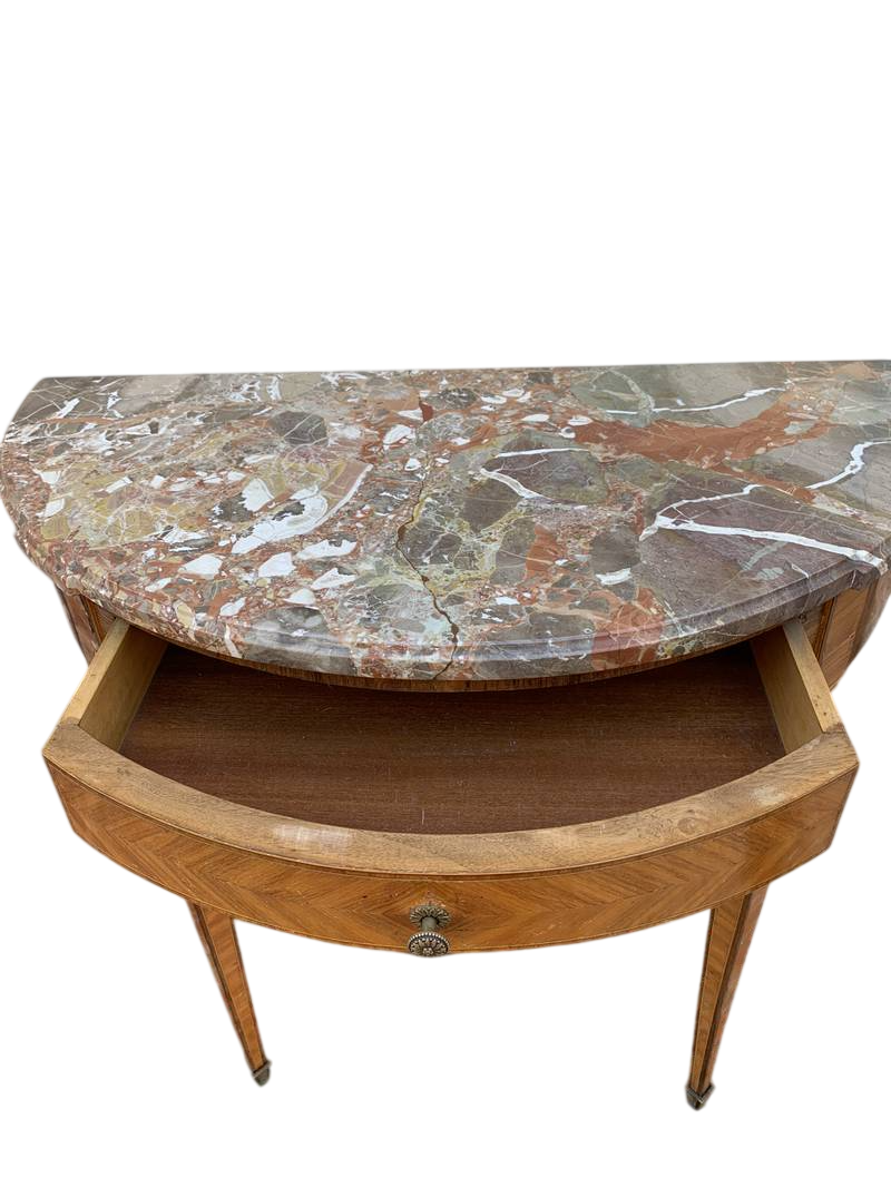 Tavolino da muro francese consolle a mezza luna (demilune) in stile Luigi XVI con piano in marmo e un cassetto sottopiano.