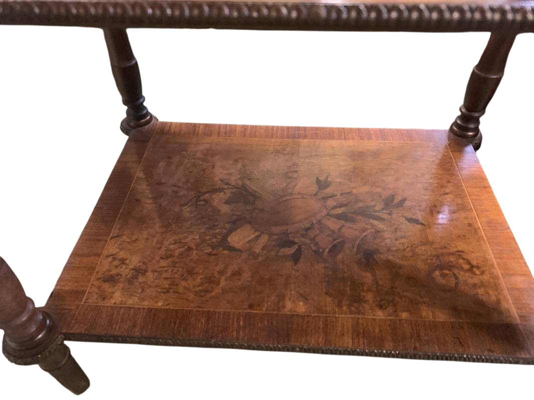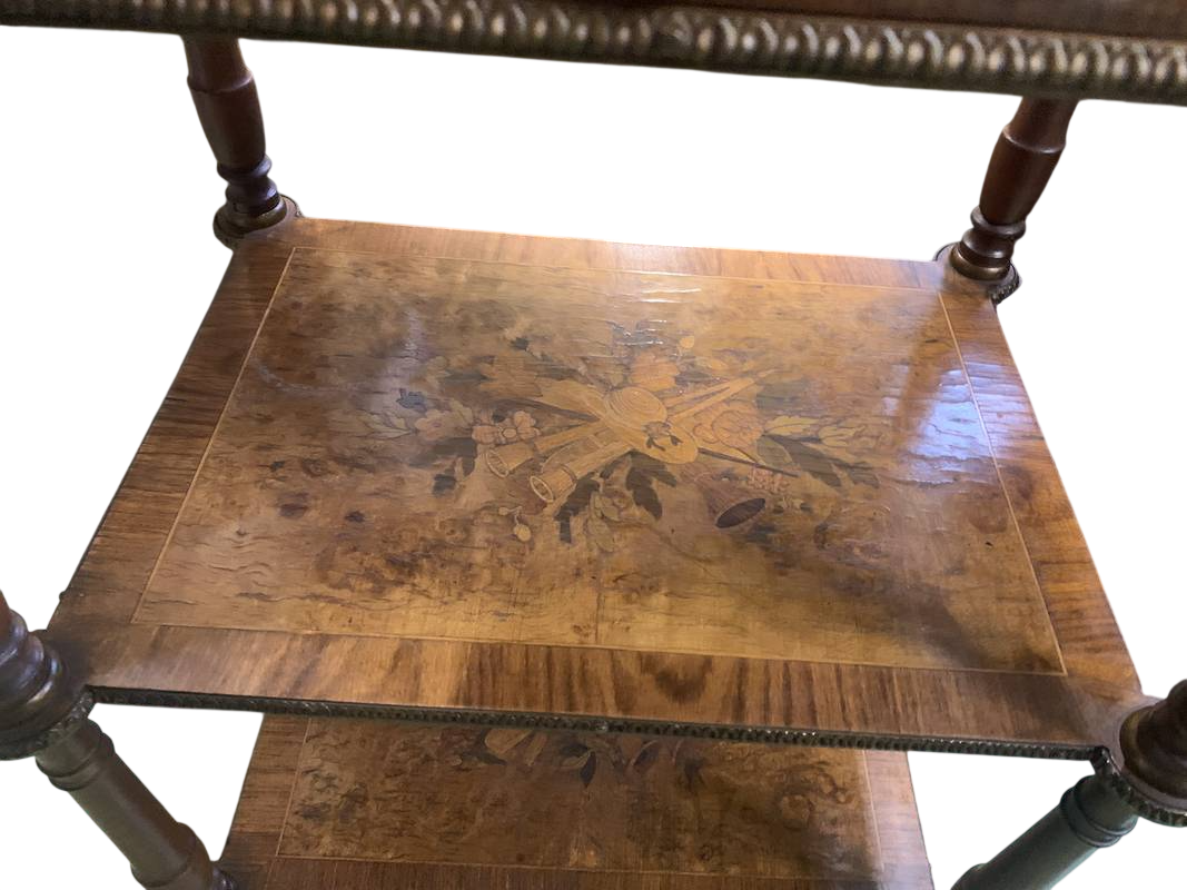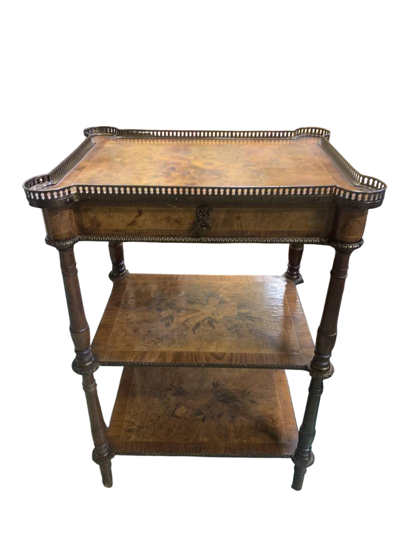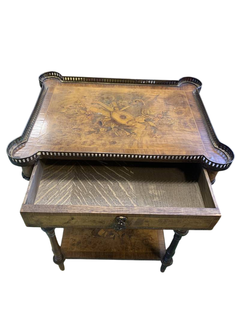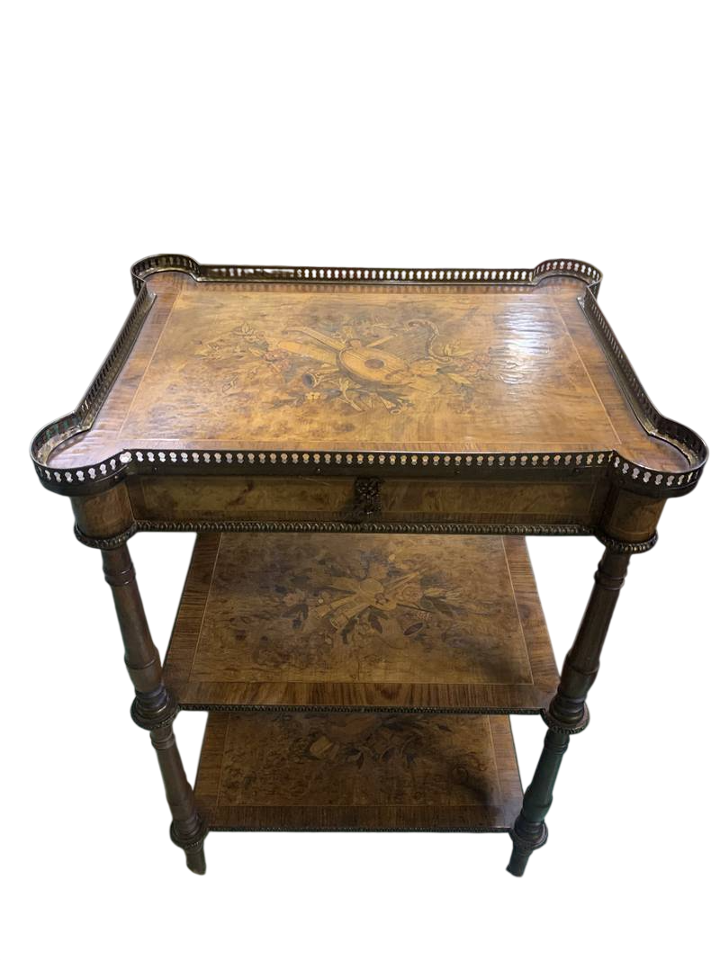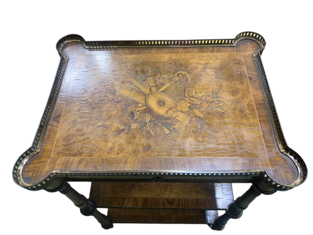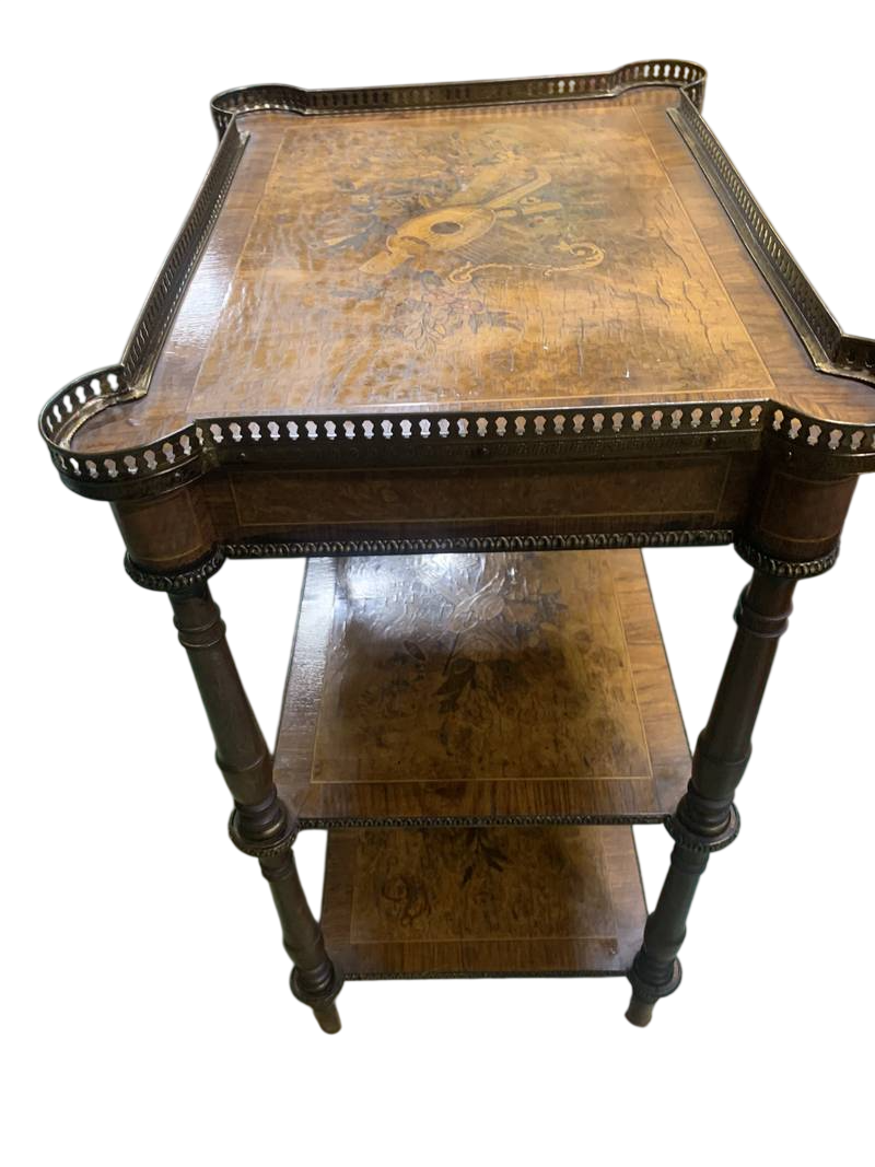 Tavolino francese finemente intarsiato con ringhierina dorata stile Napoleone III