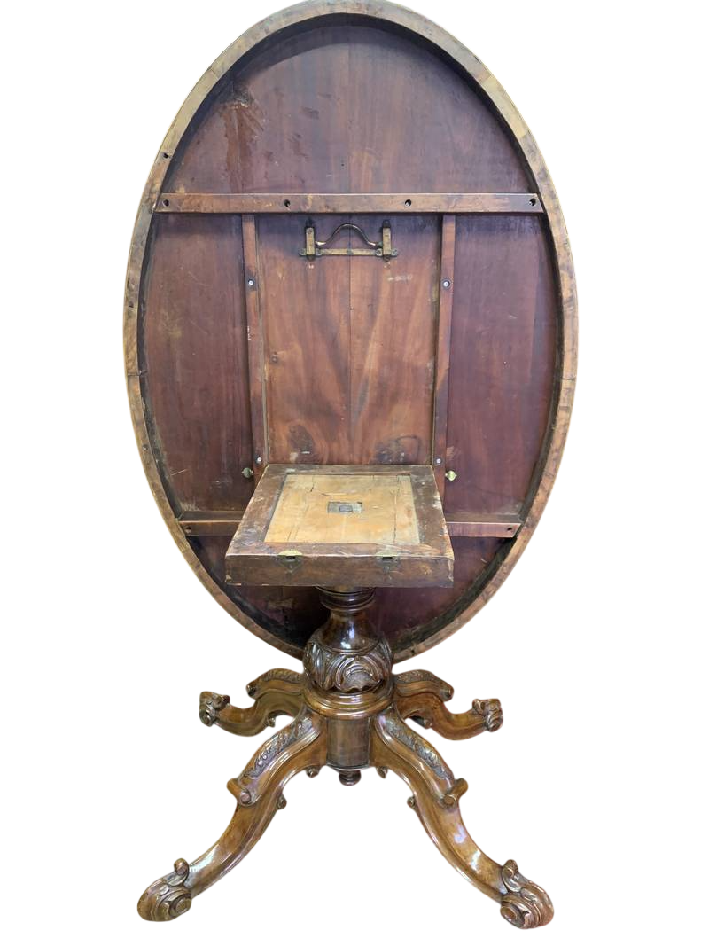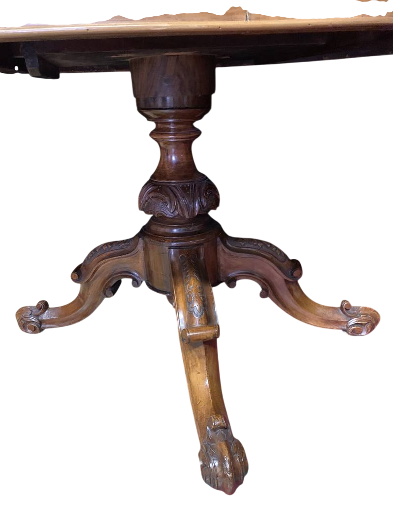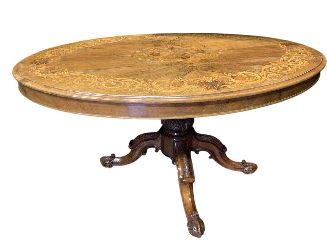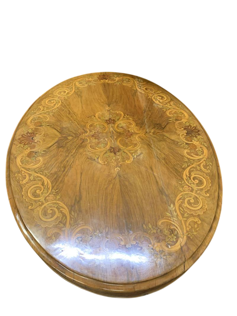 Tavolo Vittoriano inglese ovale in radica di noce Londra piano intarsiato epoca XIX secolo