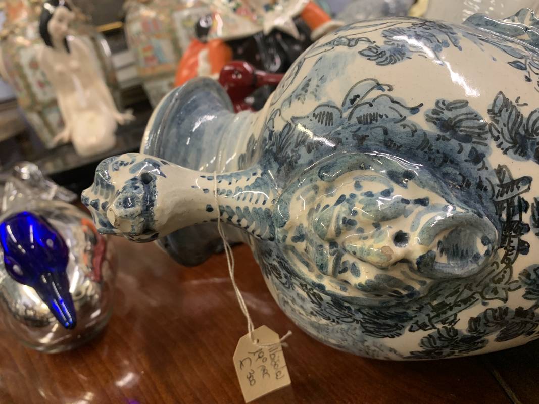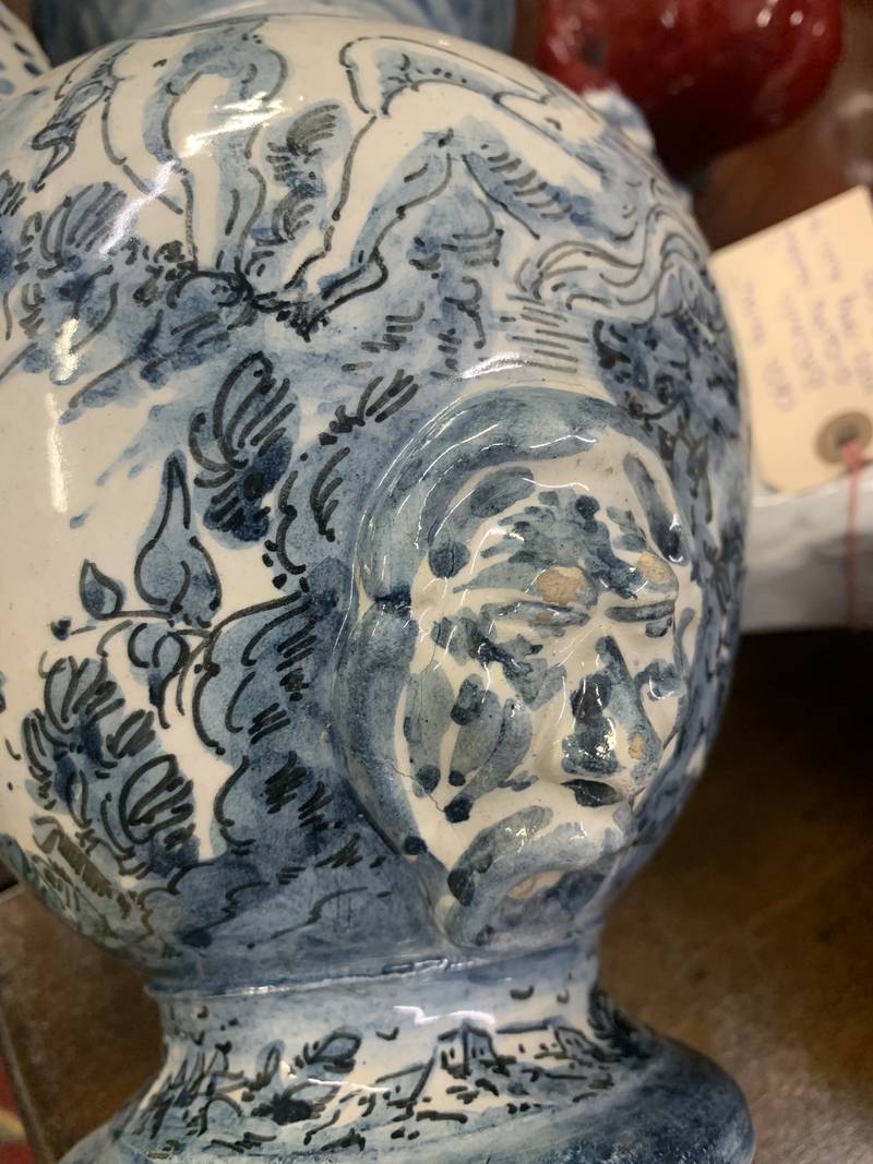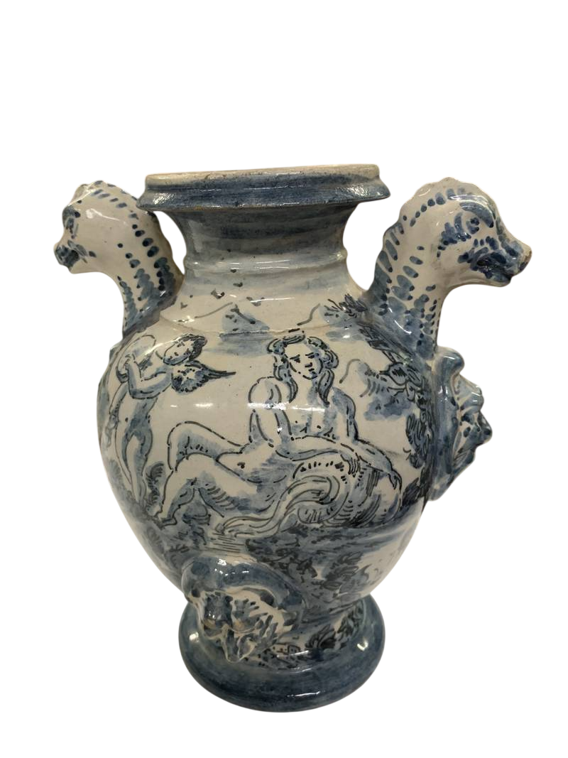 Vaso idra stagnone Albisola maiolica bianca e blu anse cavallucci marini Epoca XIX secolo
