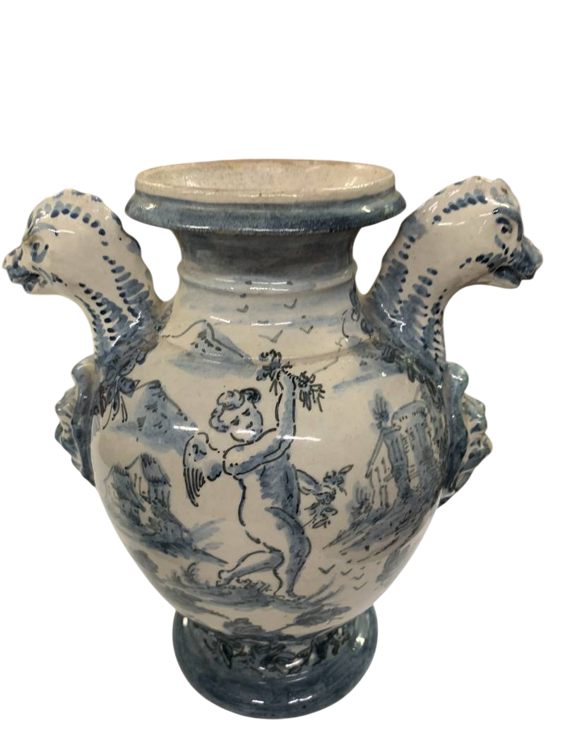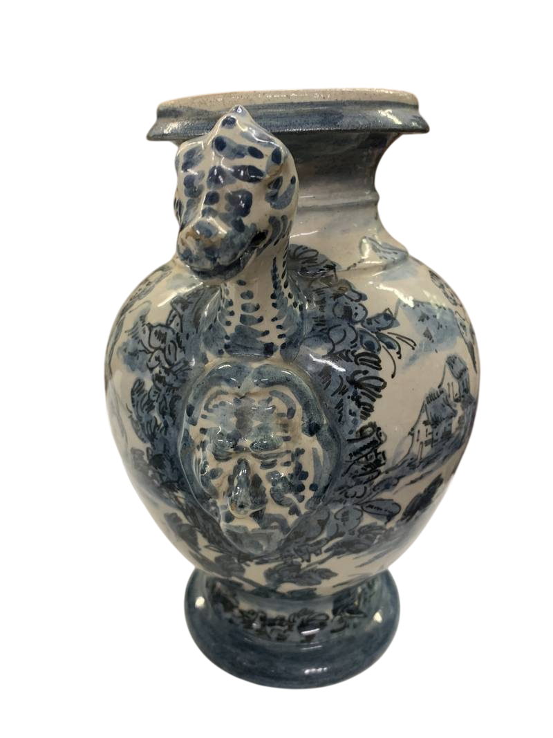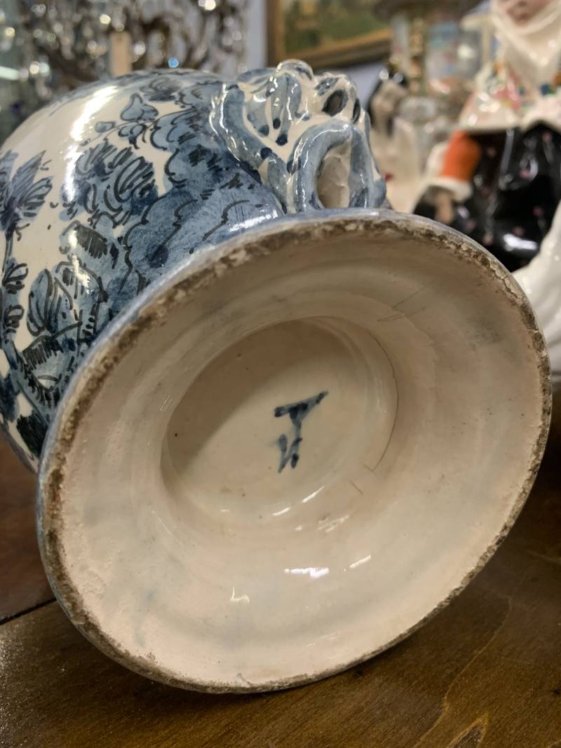 un gvaso anfora biansata in maiolica decori bianchi e blu con anse zoomorfe