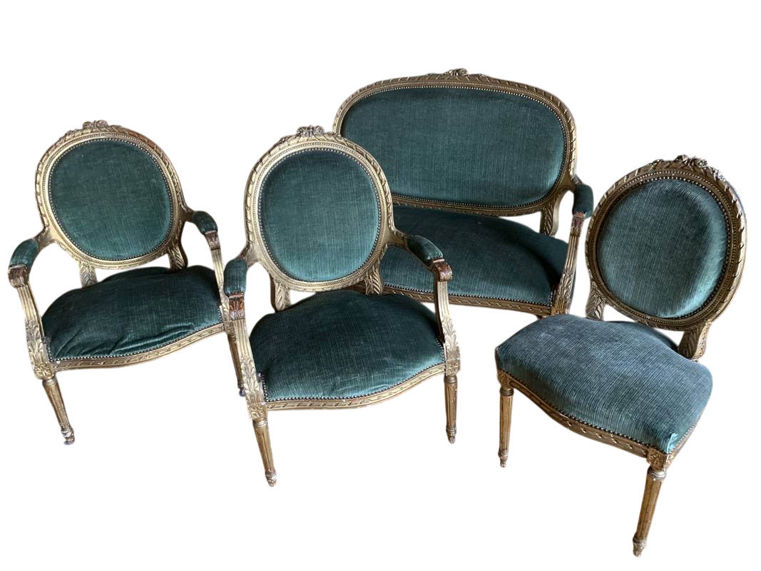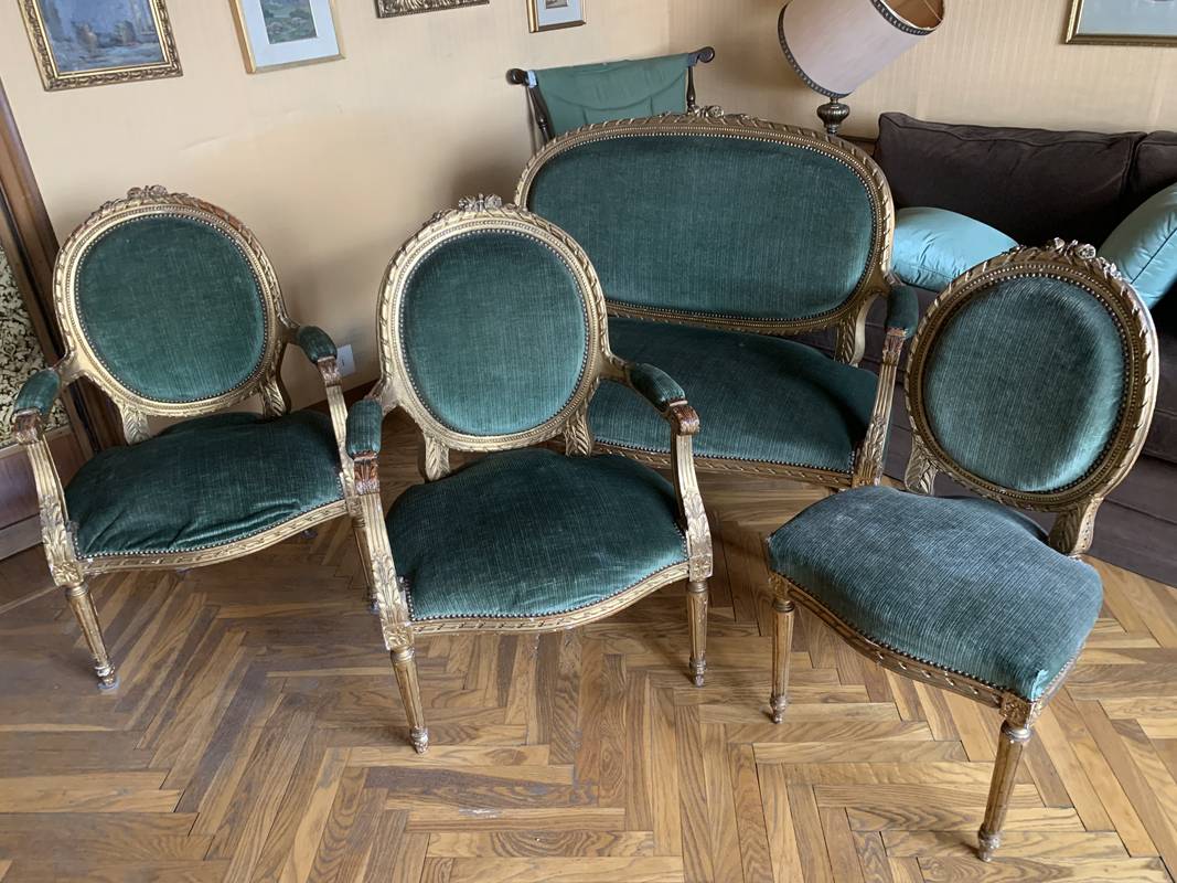Antico salotto dorato Epoca XIX secolo divano con due poltrone e due sedie Stile Luigi XVI