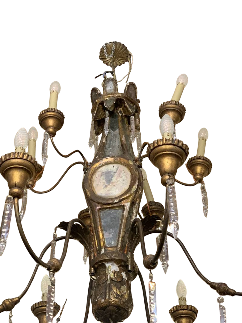 Antico grande lampadario a cascata a 8 fiamme cristallo e bronzo dorato tardo Impero